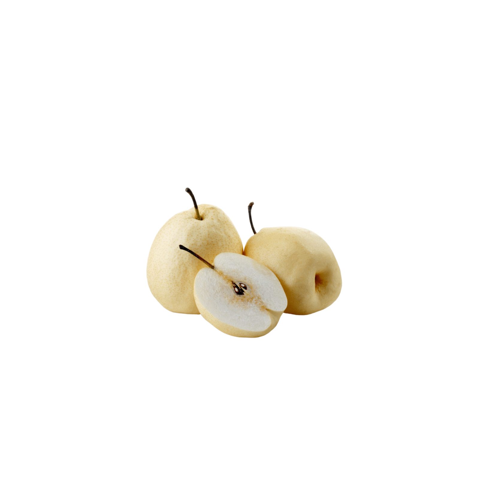 These pears are sweet and crunchy. They have a skin that is pale white to light yellow, and the inside is white.